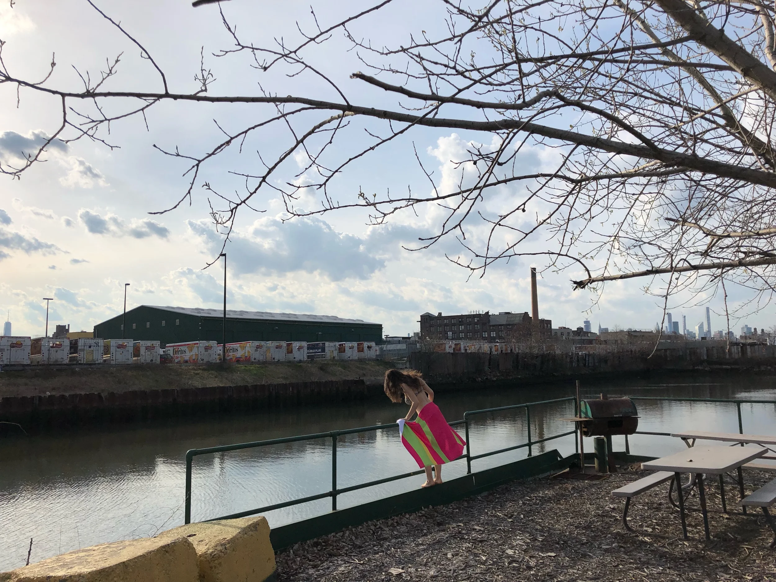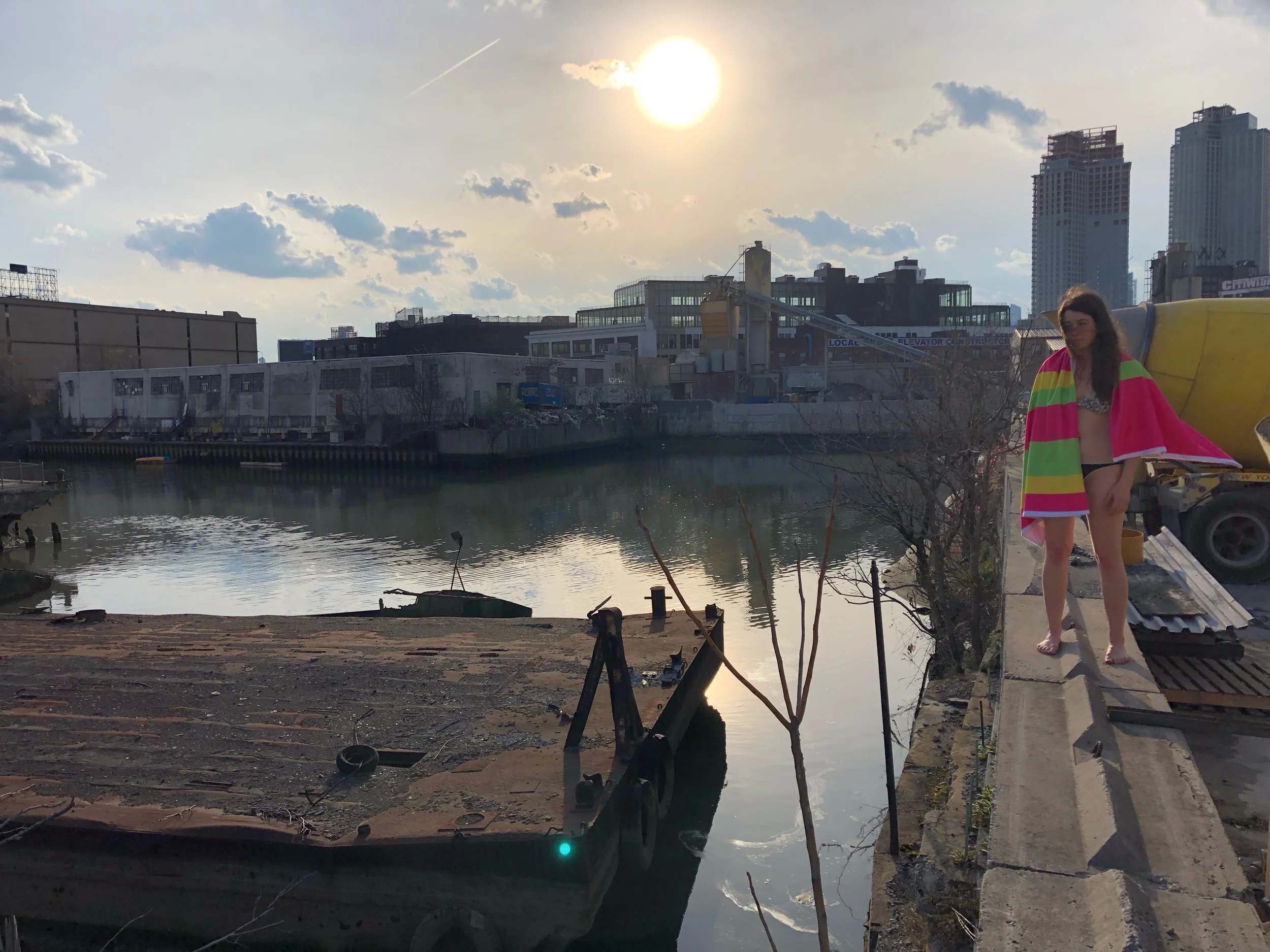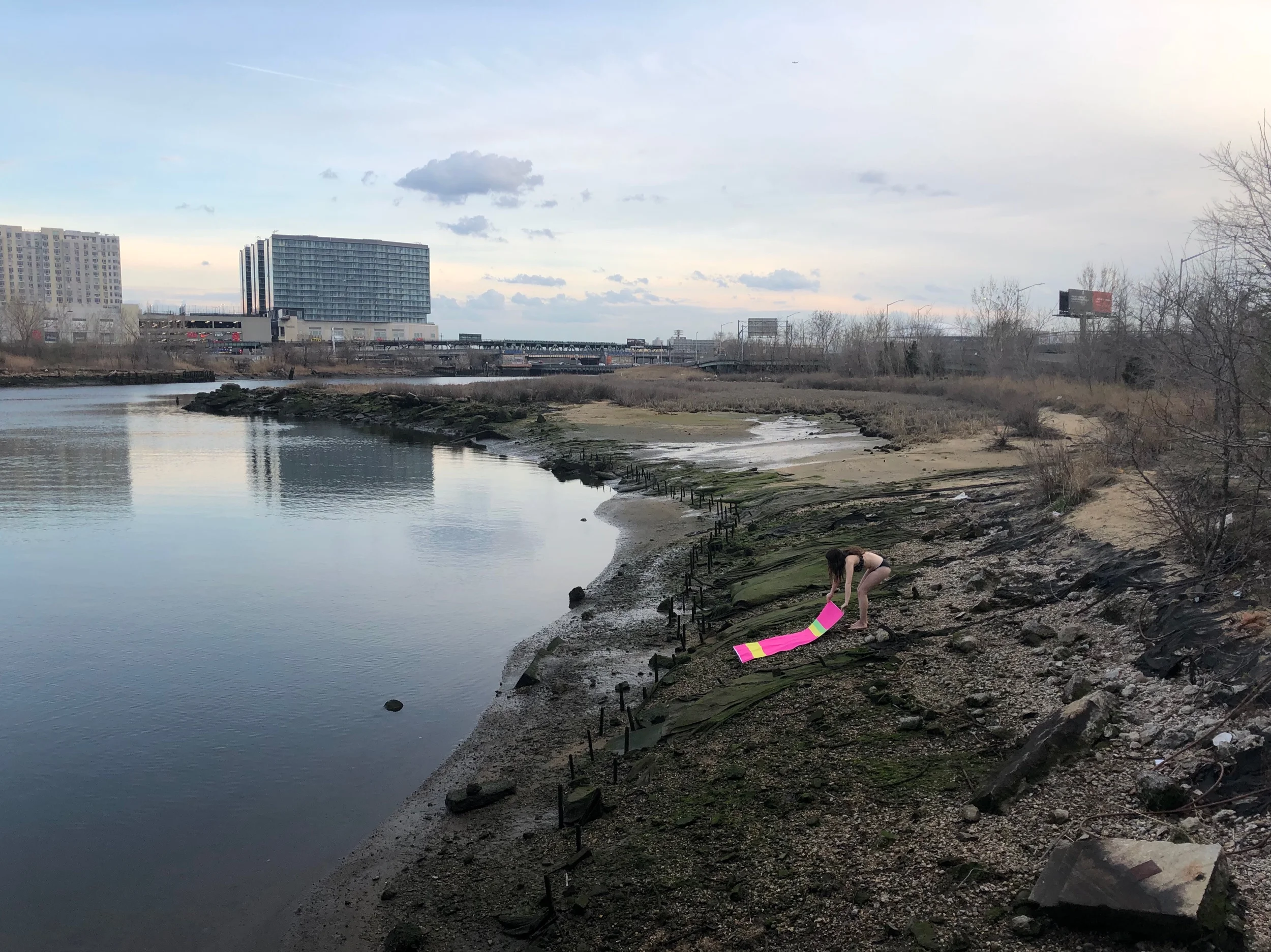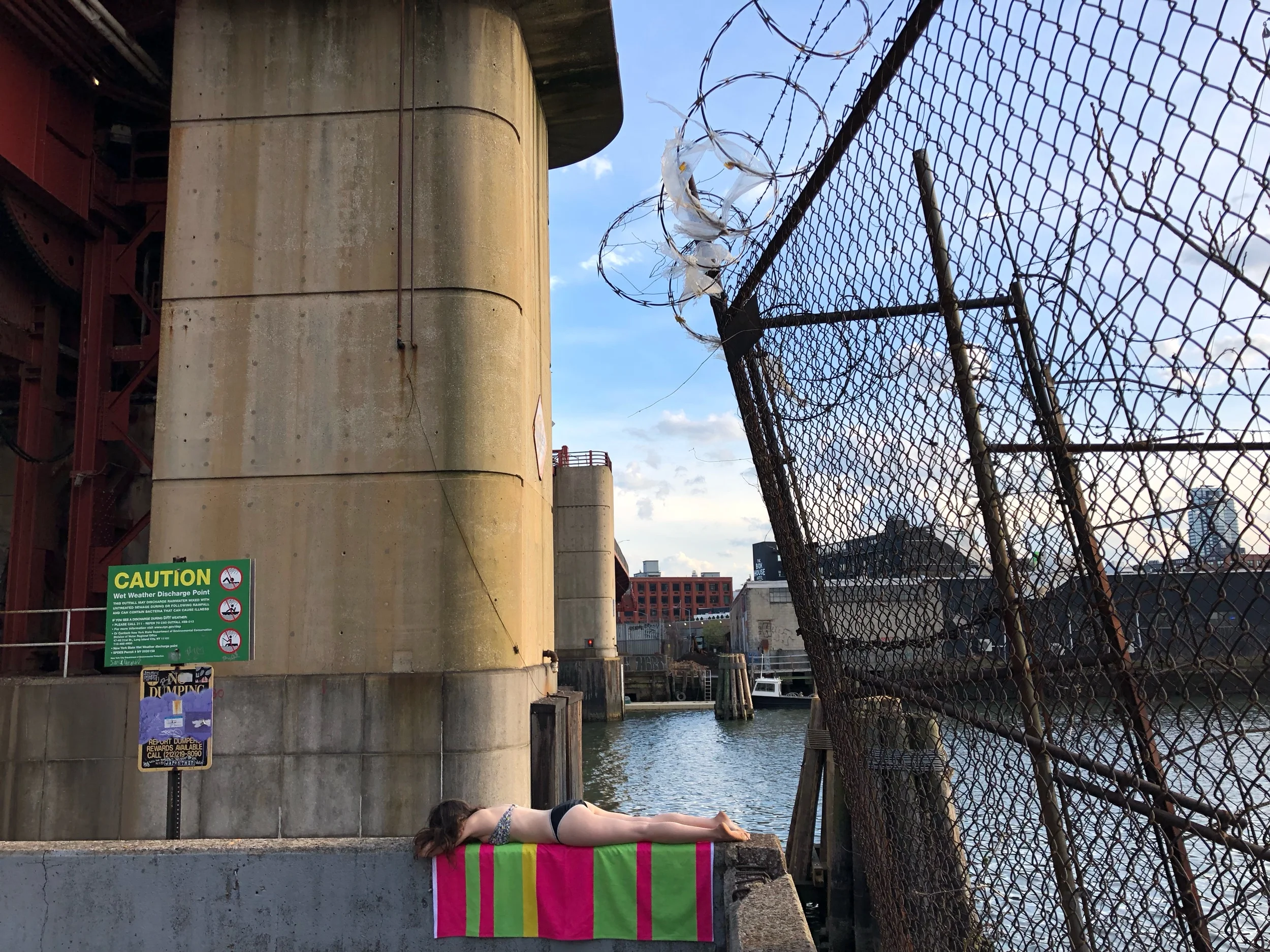 These custom beach towels show 20 weeks of 2018 Citizens Water Quality Testing (CWQT) data measuring levels of enterococcus in specific sample locations in NYC’s harbor. High concentrations of enterococcus typically indicate the presence of combined sewage overflows (CSO), and that people should avoid touching the water. Green, yellow, and pink bands correspond to NYC Department of Health enterococcus standards for swimmable water-- pink means bad. Every year about 20 billion gallons of raw sewage and unfiltered stormwater flow into NYC’s harbor by way of CSOs.